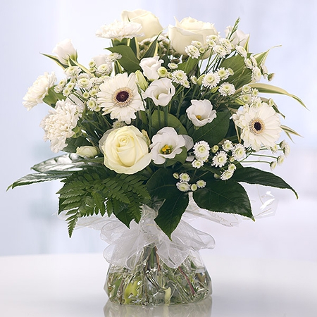 A végeredmény egy fehér színvilágú csokor aquapack-ban.