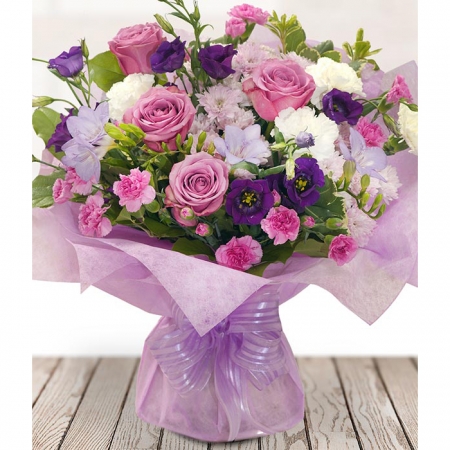 Csodás virágcsokor, amely bármely alakalomra tökéletes választás. Friss virágokkal, rózsaszín, lila és krém színvilágban