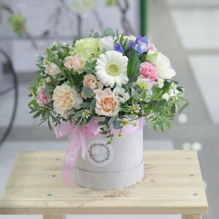 Pasztell színvilágú virágdoboz szezonális virágokkal