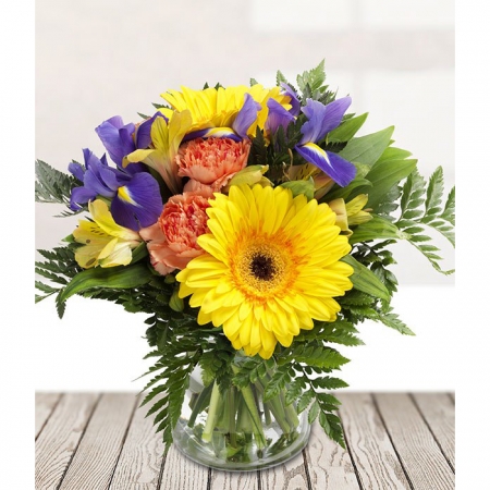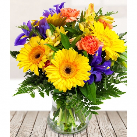Színes, élénk és gyönyörű virágcsokor. Sárga. lila és narancssárga színvilágban szezonális virágokkal. Ezzel a csokorral biztosan mosolyt csalunk szeretteink arcára. Virágküldés szeretettel.